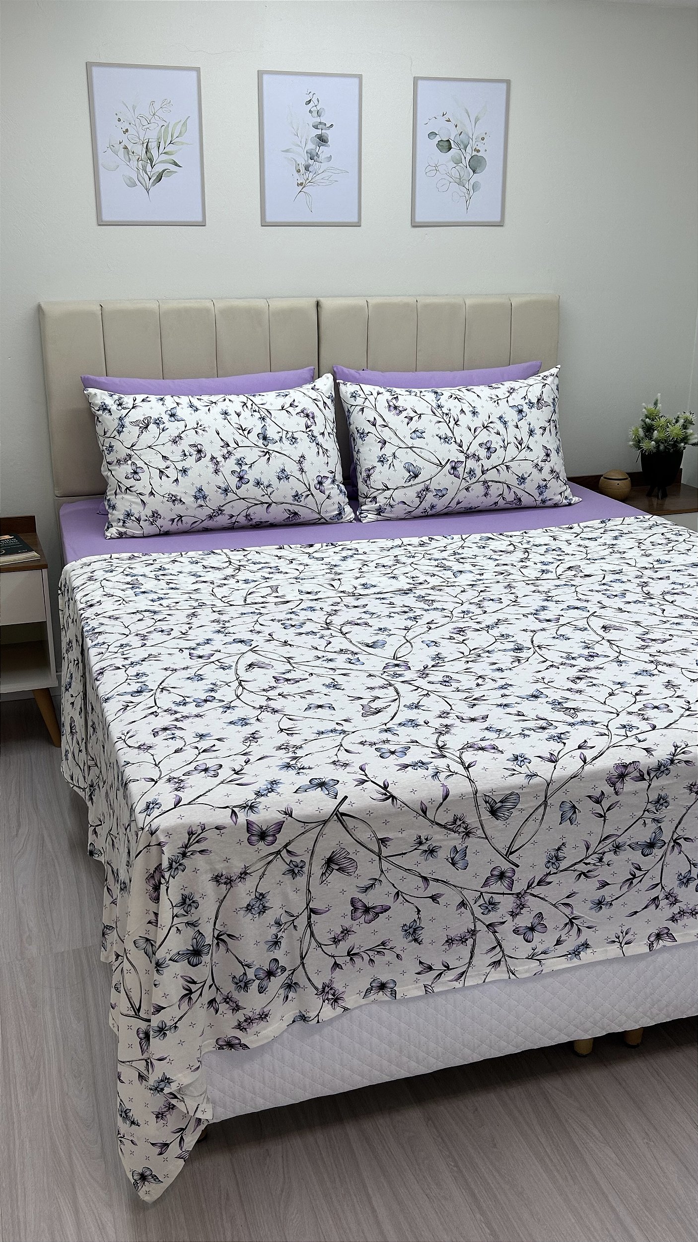 Conjunto 4 peças Lilás com fronhas Borboletas Azuis e Lilás- Queen
